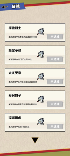 2、点开左上角的按钮,能看到成就页面。去把对应的成就做了,能拿到“诸葛扇子”,这玩意儿在关键选择上能给你提示,挺有用的。大家看下面这张截图就明白了。