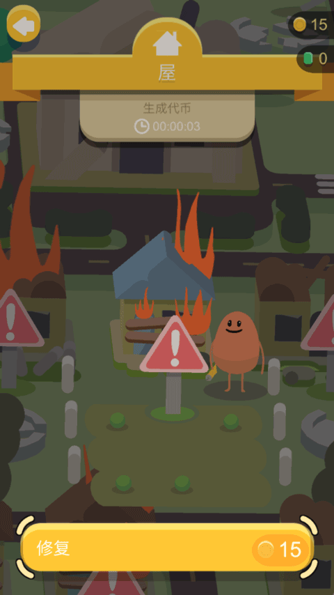 2、 房子盖好后可能会损坏,需要用闯关赚来的金币去修理它们。