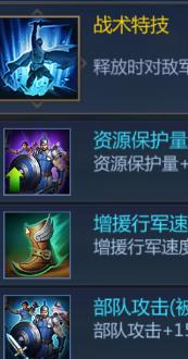 这些军团技能,500%的伤害倍率中规中矩,后面那几个资源保护、行军速度和部队攻击的被动加成,才是真正有用的东西。看到截图里这个界面没,都是直接加在面板上的,非常实在。