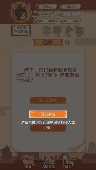 剩下的就是你的自由时间了。想跟后宫妃子们增进感情就去逛逛皇宫,刷刷好感度。或者去京城里溜达一圈,能触发不少随机事件,见识点市井百态。