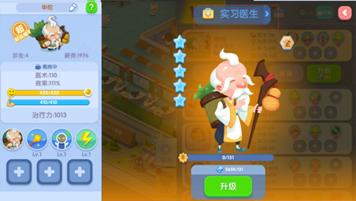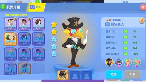 通过治疗病人和完成订单任务,员工能获得经验升级。当等级达到一定要求后,就可以用职员证书来给他们晋升职称了。