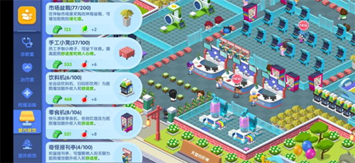 这些装饰品能提升医院的绿化和舒适度,病人的心情也会受此影响。要是病人心情不好,可能会直接走人,那这次治疗就算失败了,还会拉低医院的治愈率。另外,多放几台饮料机和零食机,还能顺便赚点外快,比单纯放凳子划算多了。绿化方面,室外植物加的数值比室内高,所以尽量买室外的。这些装饰和植物都需要维护,当它们头上出现小水滴图标时就是该浇水了,出现扳手图标就是该维修了,点一下就行,操作很简单。(户外的土地需要用铲子和锯子来开发,这些工具商店里有卖。开发土地的时候还可能挖到钻石,算是个小惊喜。)