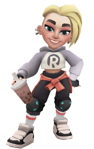 这妹子叫卡特琳,地铁城来的,一头金发,青色的眼睛。身上穿了件紫色的短款连帽衫,胸口有个R字母。下身是深紫色的运动裤,带护膝,手上还有个无指手套,跟杰克某套衣服有点像。脚上是灰色袜子配灰黑运动鞋。
