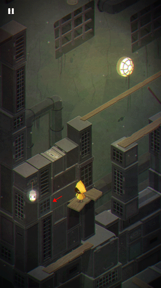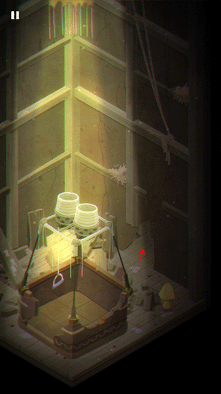 1、开局就是摩诺拿门顶着外面的东西,第一关场景里,摩诺在一个像是篮子的装置里,你得按住上面的拉杆才能让他安全落地。