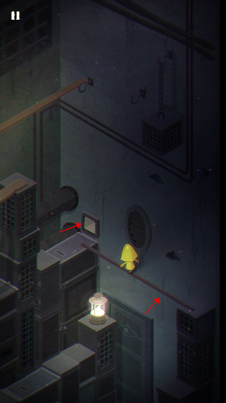 7、摩诺顺着梯子往下溜的时候,得赶紧把左边箭头指着的那扇窗户给关上。