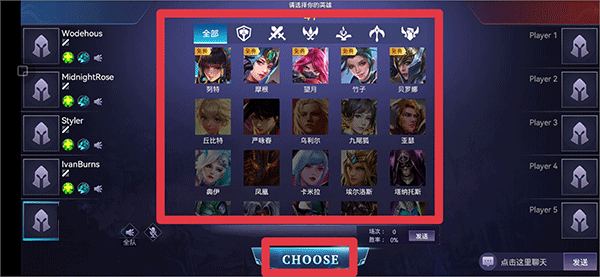 4、在选英雄界面选择已拥有的角色,并点击“CHOOSE”确认。
