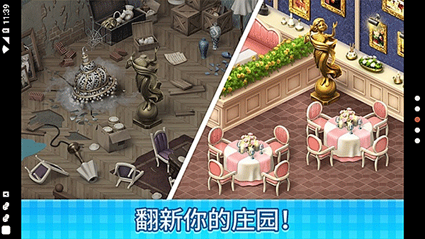 恭喜你,这家充满潜力的庄园咖啡厅现在是你的了!不过,它现在看起来有点破旧。别担心,这正是你大展身手的好机会。通过挑战有趣的三消关卡,你就能获得资源,亲手设计和翻新这里的每一个角落。从吧台到花园,一切都由你决定。当然,别忘了研发新菜单,用美味的咖啡和甜点吸引更多顾客,一起见证这座庄园重焕生机吧!