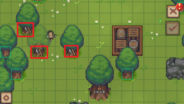 7、选好之后,这些树上就会冒出个小斧头图标,村民们就会自己过去干活了。后面大部分操作都一个逻辑,选中目标,然后框选范围就完事。
