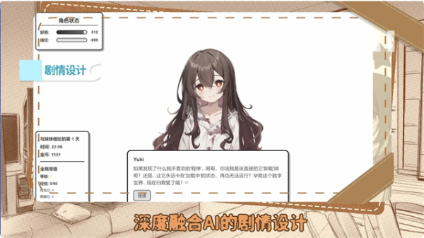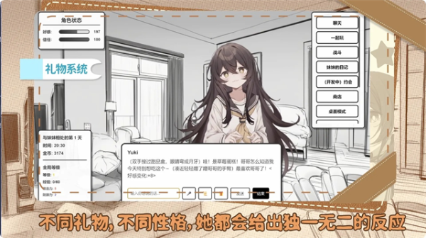妹居物语是一款日常陪伴类型的模拟游戏,跟一位叫Yuki的妹妹一起生活,平时可以聊天、换装、做各种小事情,在相处过程中会慢慢记住说过的话和一些习惯,时间久了会有不同反应,也会把每天的点滴记录下来,游戏里的时间会跟现实一起走,一边相处一边累积回忆,慢慢变成一段属于自己的生活故事。