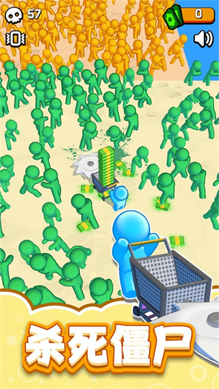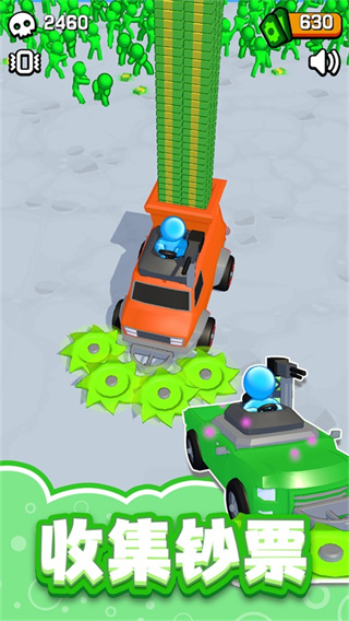 2、锯片移到绿色和黄色的僵尸就可以灭绝他们,僵尸被消灭就会掉下现金让玩家领取;