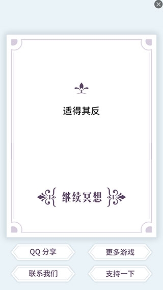 要说这玩意儿有啥优势, 那就是操作确实无脑, 全是点击式, 上手零成本, 对懒人极其友好。它给你的指引虽然玄乎, 但有时候确实能让你换个角度想问题。你可以在里面不停地“冥想”, 也就是反复抽卡, 直到刷出个自己想听的答案为止。玩法本身没啥深度, 但就是这种简单粗暴的方式, 反而让你觉得有点意思, 帮你从牛角尖里暂时钻出来。说它能指引人生有点夸张了, 但帮你下个小决心, 开个好头, 还是可以的。