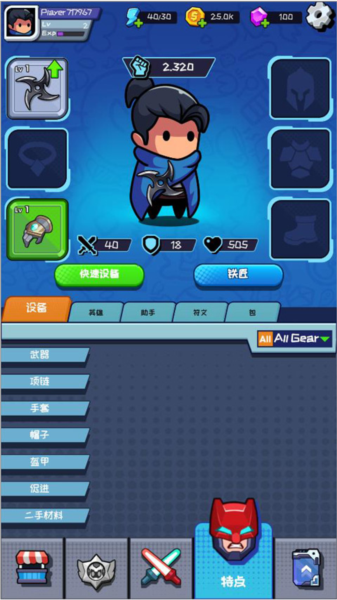 3、点开英雄页面,你可以在这里给你已经抽到的或者解锁的角色换上更好的武器和装备。