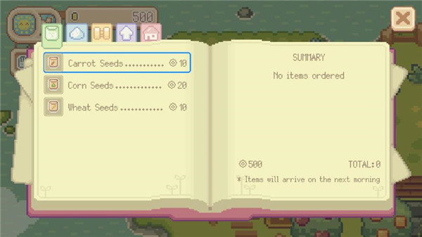 6、翻开书能买点种子之类的基础物资,算是前期的新手商店吧。当然里面还有些别的门道,得自己慢慢摸索才能发现。