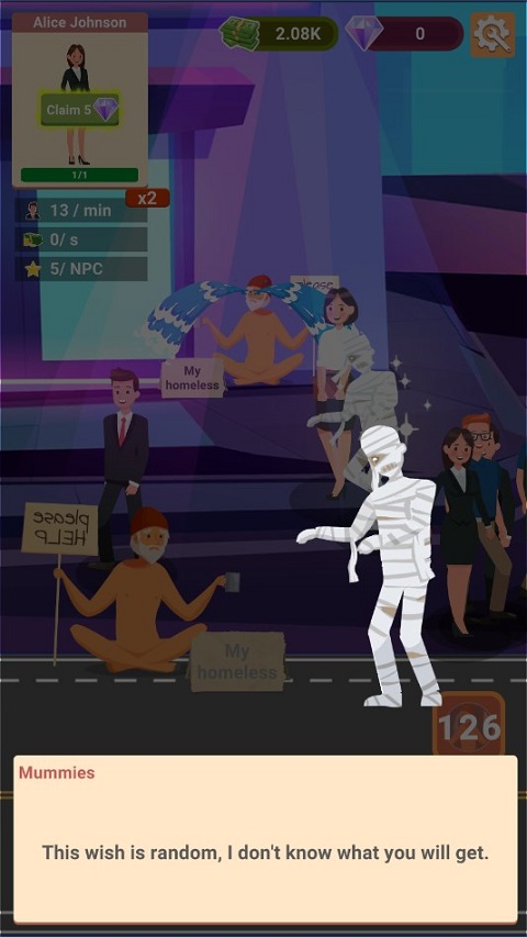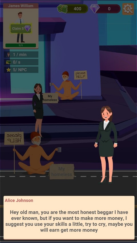 2.游戏里谋生的路子不少,你可以选择最原始的办法一路要饭,也能换个活法,整个cosplay当个魔术师、街头画家,或者吹萨克斯,甚至扮成宇航员。当然,你也能满世界溜达,看看能不能撞大运找到翻盘的机会。玩法挺开放的,可能性给得足。但不管你怎么折腾,开局都得靠乞讨赚到第一天的饭钱,没得选。后面钱多了,可以买点破烂衣服换上,搞个“流浪汉时尚”,居然也能增加收入,这设定也是绝了。赚钱的路子还有很多,有兴趣的可以自己下来挖一挖。