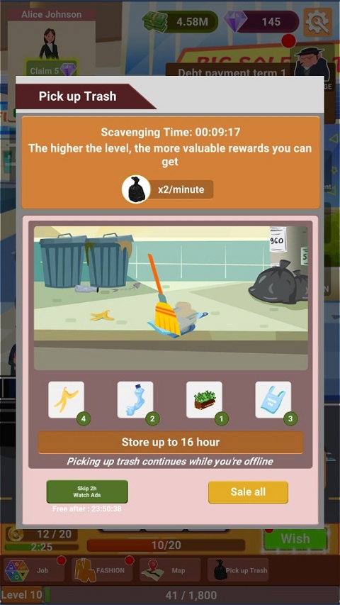 3.另外,游戏里还有不少别的工作,比如打扫卫生、做做手工活什么的。只要条件达到了,你就能开启各种赚钱路子,慢慢积累资本,离东山再起就不远了。