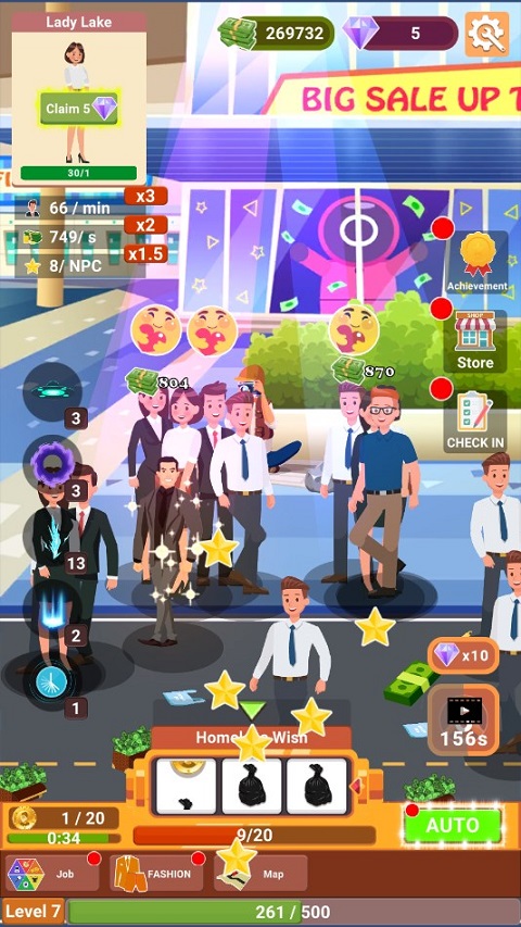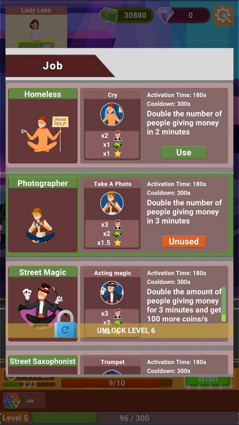 2.工作也是可以升级的,升级就能解锁更多套装,换上更高级的套装,赚钱效率就越高。表演的时候,别忘了用技能吸引路人围观,人越多钱越多。