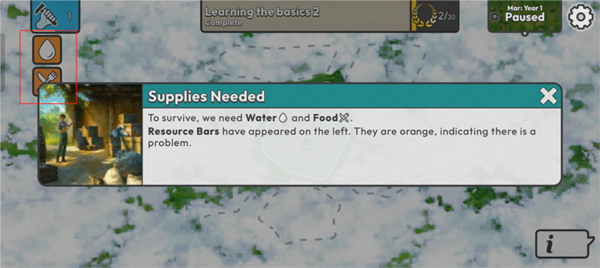 3、人是铁饭是钢,水和食物是活下去的根本。注意看左边的资源条,一旦变成橙色,就说明资源告急了,得马上想办法解决。