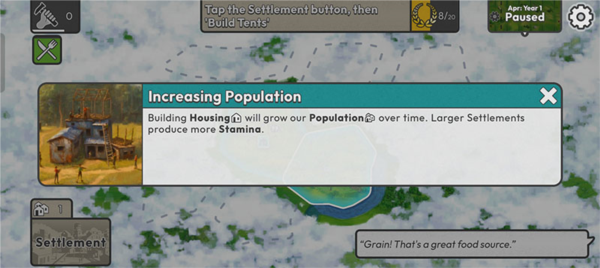 7、靠着慢慢积累的资源,开始逐步造房子,增加人口上限。人多了,你的聚居地规模才会变大,体力的产出也会跟着提高,为后面的发展打好基础。