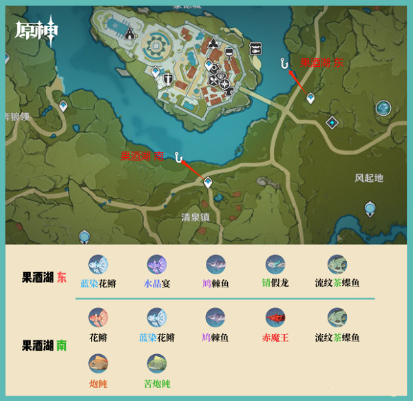 果酒湖南岸的鱼种是:花鱂、蓝染花鱂、鸠棘鱼、赤魔王、流纹茶蝶鱼、炮鲀、苦炮鲀。(具体位置看下面这张图)