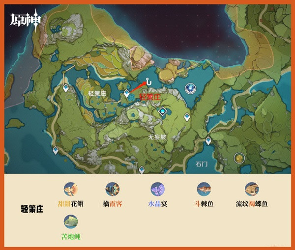 璃月地区的钓鱼点有七个,分布在:轻策庄、望舒客栈、归离原、奥藏山、琥牢山、渌华池和天遒谷。