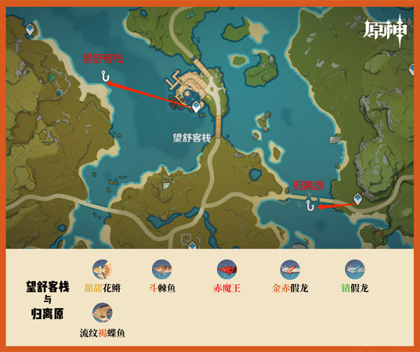 望舒客栈下方的水域有:甜甜花鱂、斗棘鱼、赤魔王、金赤假龙、锖假龙。