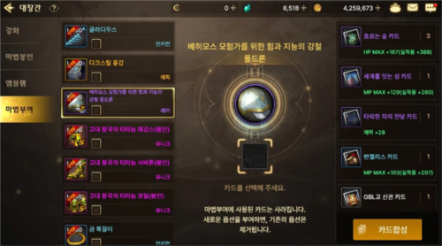 4、铁匠铺里能搞的最后一个声望提升项目,就是“附魔”。刷图过程中会随机掉各种怪物卡片,把这些卡片合一合,就能给装备附上各种属性,从而提升声望。不过这玩意儿跟徽章不一样,徽章拆装备的时候会还给你,附魔用的卡片可就没了。所以前期那些过渡装备,附魔感觉有点浪费。建议多用普通和高级卡片先凑合着,稀有卡片最好留着给毕业装用。