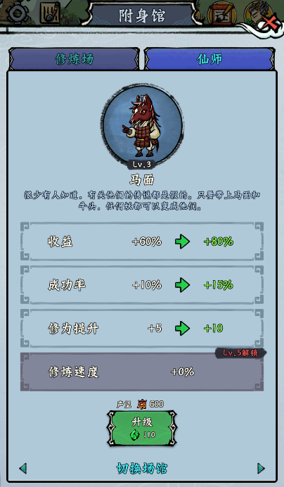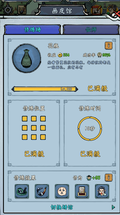 2、游戏里每个场地和设施都可以升级,拿“画皮馆”这个修炼场来说吧。升级能提升场馆的豪华度,从而增加收益利润,还能加修炼位、缩短修炼时间。如果再安排个仙师坐镇,修炼效果会更好。