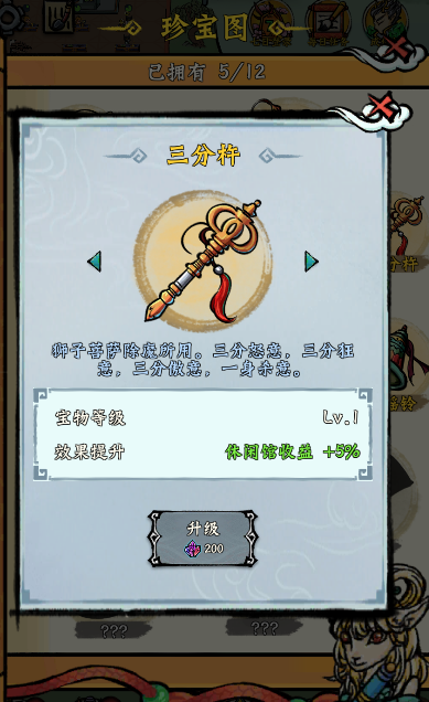 3、关于珍宝解锁的顺序,建议先把气运莲和三分杵给解锁了,这两个能把你的经济收益直接抬高一个档次,对后面升级道场帮助很大。