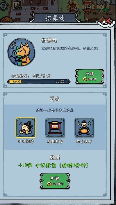 1、慕名而来的小妖数量,会随着你宗门前台的等级提升而增加。他们会先在前台登记,所以提升前台等级可以加快报名效率。同时,你也可以在这里招募更多的接待员,来处理更多学员的事务。