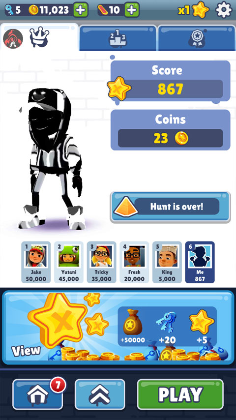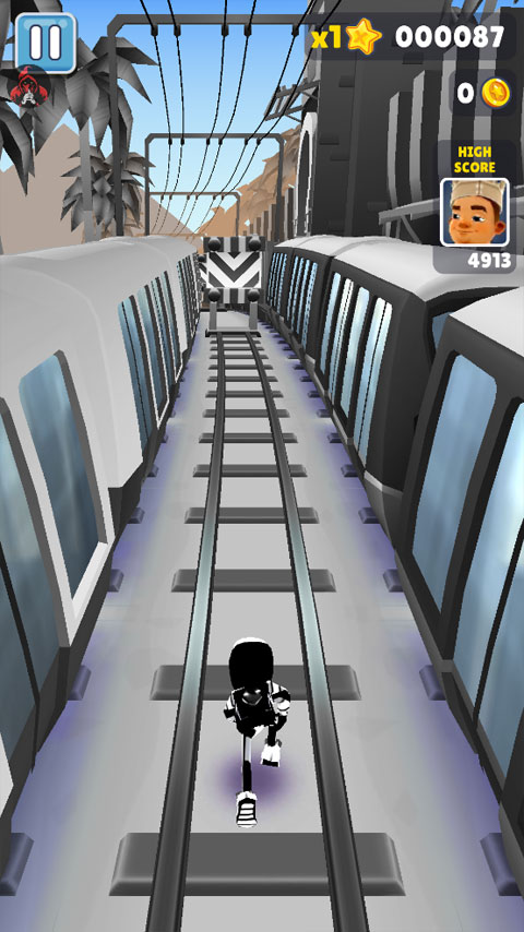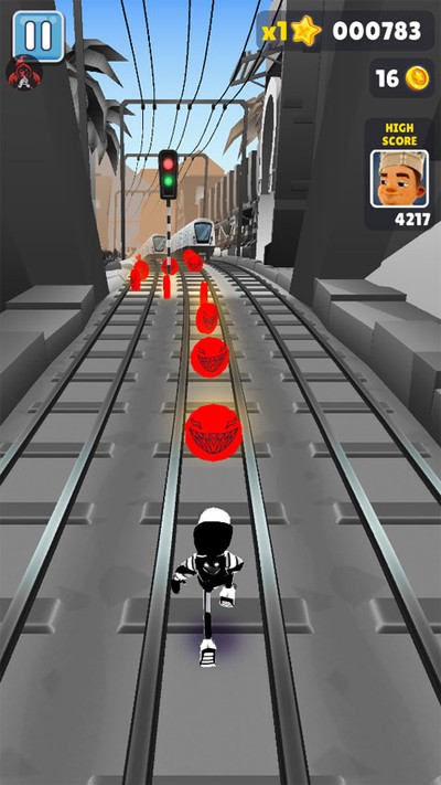 2、操作还是那个味儿,你可以解锁一堆角色,然后带着他们在轨道上玩命走位,疯狂躲避各种障碍物,核心就是别被逮到。
