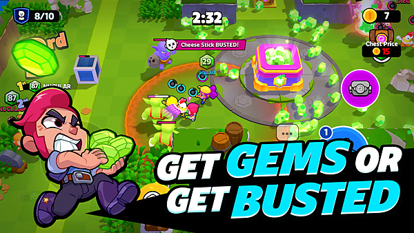 - 这个模式是双排,你跟一个朋友组队,去对抗另外三支队伍。目标很简单,还是抢宝石,抢得最多的队伍获胜。赢家能分到大部分战利品,输了也能拿点安慰奖。这模式里还有任务、表情、皮肤、5v5和排位赛,每个角色都有自己的特殊技能。