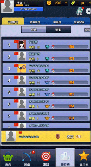 5、打比赛能拿积分,大厅里有个排行榜,能看到你跟全球玩家的排名差距。没事可以看看,激励下自己。