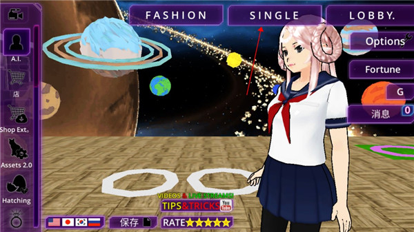 1、打开女子校园模拟器中文版,选择左下方【国旗】图标。