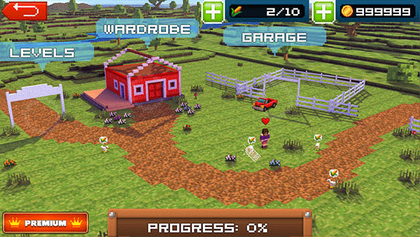 主界面就是那个农场。左边大门通向所有关卡,点那个红房子能给主角换个造型,右边的车库则是用来换车或者给车子做点升级。布局很简单,一眼就能看明白。