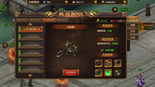 3、游戏里有茫茫多的BOSS可以打,在挑战BOSS界面能看到列表,记住,有一个算一个,能打的都别放过。