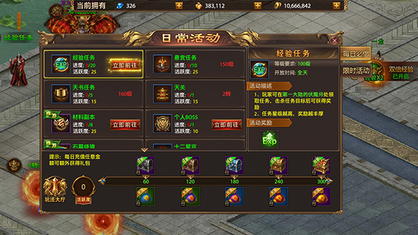 2、游戏刚开始,啥也别管,跟着主线任务一路点下去,经验给得最多,等级升得飞快。后面等级卡住了,就去做经验任务、天书任务、悬赏任务这些,或者去石墓烧猪、膜拜城主,离线也能探险拿经验。