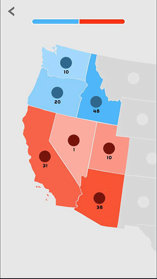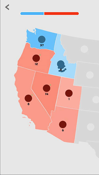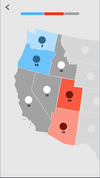2、地图由多个区域组成,有颜色的地块代表敌我阵营,灰色地块为中立区域,玩家需要逐步占领所有地块。