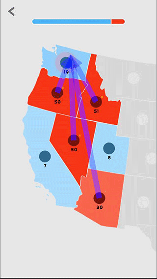 3、拖动地块中心的圆点即可派遣单位进行扩张,圆点旁数字代表兵力数量,并会随时间自动增长。