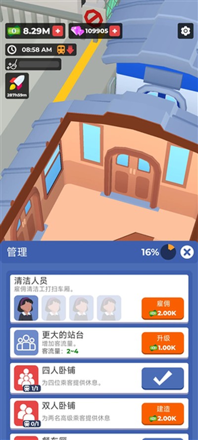 3、游戏的成长路径很清晰。核心就是“经营-赚钱-升级”这个闭环。赚了钱就投进去升级设施,比如把普通卧铺改成豪华单间,或者在餐厅加几个新菜品。酒店越好,吸引的客人越多,赚的钱也越多,这种正向循环玩起来很上头。