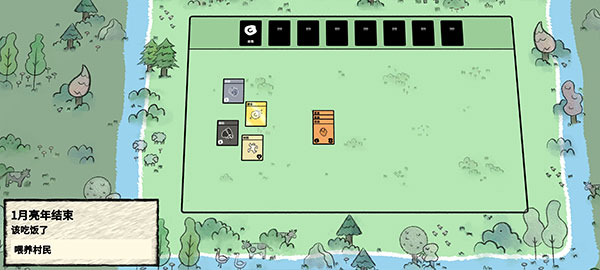 6、就这么玩着玩着,一个“月亮年”就过去了,系统会提醒你该喂饭了。点那个“喂养村民”,你手里的浆果卡就没了,村民才能活下去。