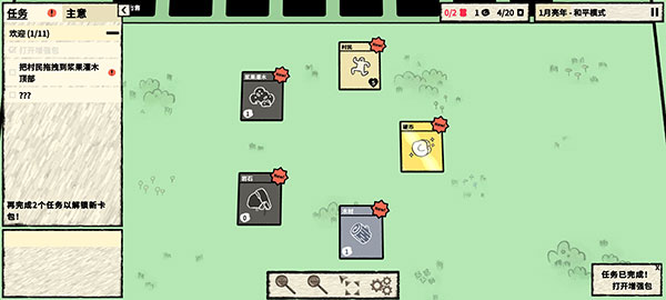 4、你看,这就开出来了五张新卡:木头、浆果丛、村民、石头还有钱。这时候就别愣着了,看左边任务让你干嘛,就把对应的卡牌拖过去堆一起。
