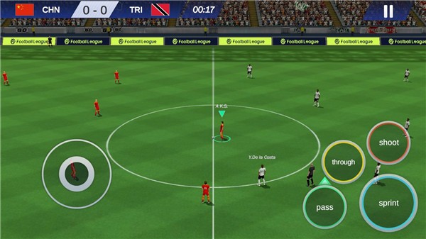6、比赛开始后左侧控制移动,右侧为功能按键,其中【sprint】为加速,【pass】为传球,【through】为直塞,【shoot】为射门或防守动作。