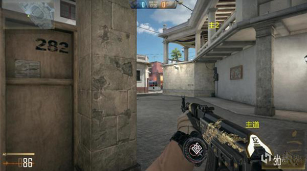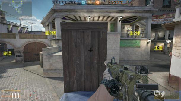 这个点的视野同样很棒,主道和副道都能看到,缺点也致命——没正经掩体。旁边那块木板子纯粹是心理安慰,一穿就透。所以别傻站着当活靶子,多利用进点位的台阶和侧面来回晃悠,打一枪换一个地方才是王道。