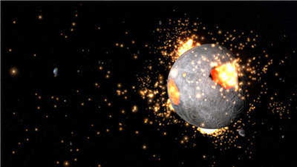2、星球之间硬碰硬的对撞场面,做得那叫一个带劲。撞完之后,星球表面上还会留下一个还在冒着热气的巨大熔融坑,细节拉满了。