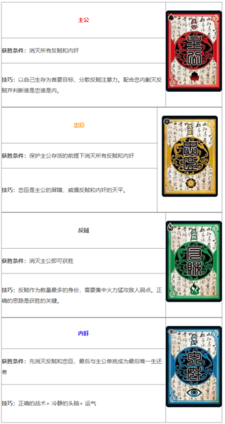 内奸:难度最高,需先清理反贼和忠臣,最后与主公单挑获胜。