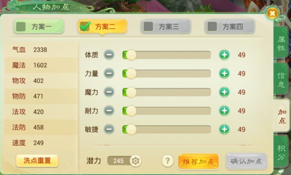 游戏里主要属性就5个:体质、魔力、力量、耐力、敏捷。刚建号的时候系统会给你一套初始值,后面每升一级,这五项属性会自动加1点,另外再给你5个潜力点,让你自个儿分配,想怎么加就怎么加。