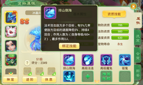 宠物技能,就是你宝宝在战斗里吃饭的家伙,有打伤害的,有回血回蓝的,也有加buff的。