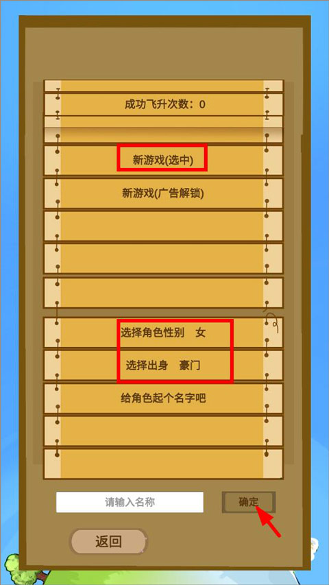 2、进来之后就是创角界面,点“新游戏”,然后选性别、出身,再给你未来的大能起个响亮的名号,搞定点确定。看下面这张截图,就这么简单。