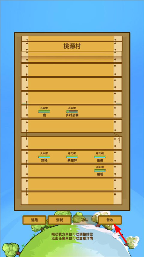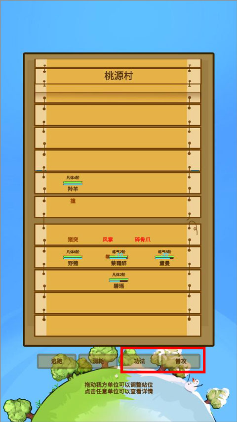 2、位置站好了,接下来就是技能对轰。对着敌人点“普攻”和已经学会的“功法”,把他血条清空就赢了。