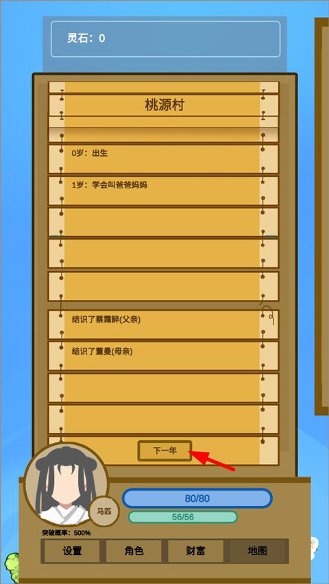 4、外观捏完,总算能正式开始了。刚开局你还是个奶娃娃,啥也干不了,直接狂点“下一年”跳时间,一直点到开蒙时期。